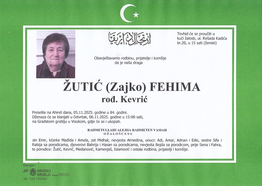 - ŽUTIĆ (Zajko) FEHIMA 06.11.2025. u 15:00 sati