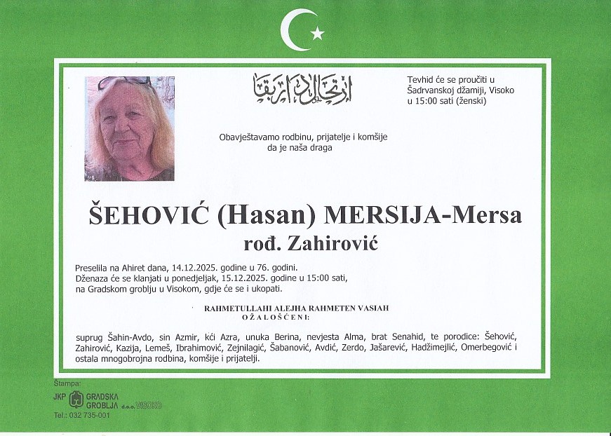ŠEHOVIĆ (Hasan) MERSIJA-Mersa 15.12.2025. u 15:00 sati