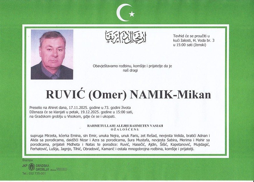RUVIĆ (Omer) NAMIK-Mikan 19.12.2025. u 15:00 sati