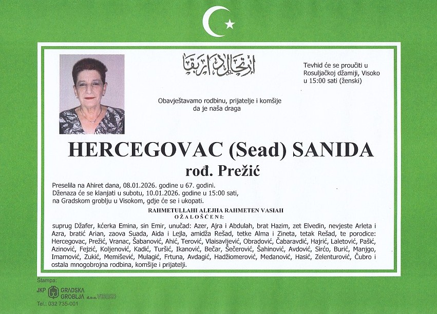 HERCEGOVAC (Sead) SANIDA 10.01.2026. u 15:00 sati