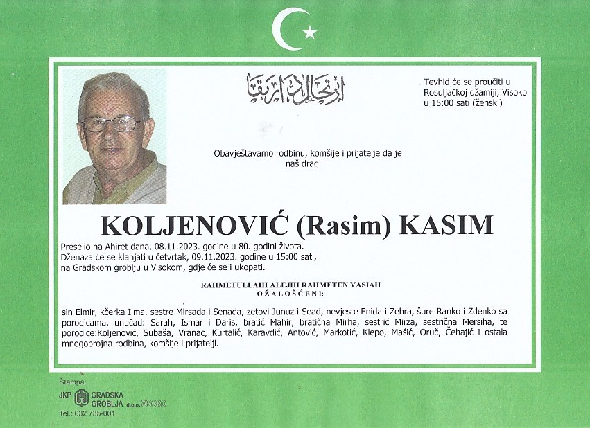 KOLJENOVIĆ (Rasim) KASIM 09.11.2023. godine u 15:00 sati