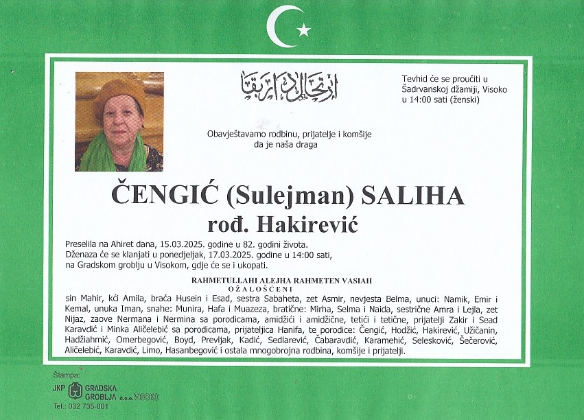 ČENGIĆ (Sulejman) SALIHA 17.03.2025. godine u 14:00 sati