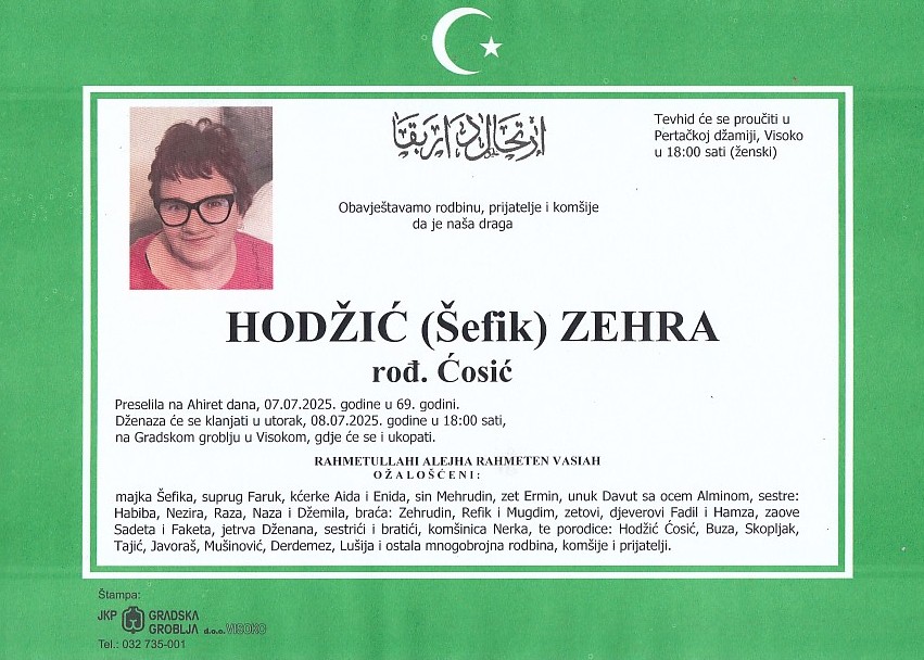HODŽIĆ (Šefik) ZEHRA 08.07.2025. godine u 18:00 sati