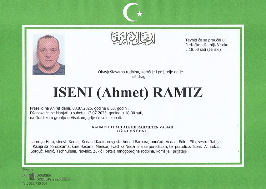 ISENI (Ahmet) Ramiz 12.07.2025. godine u 18:00 sati