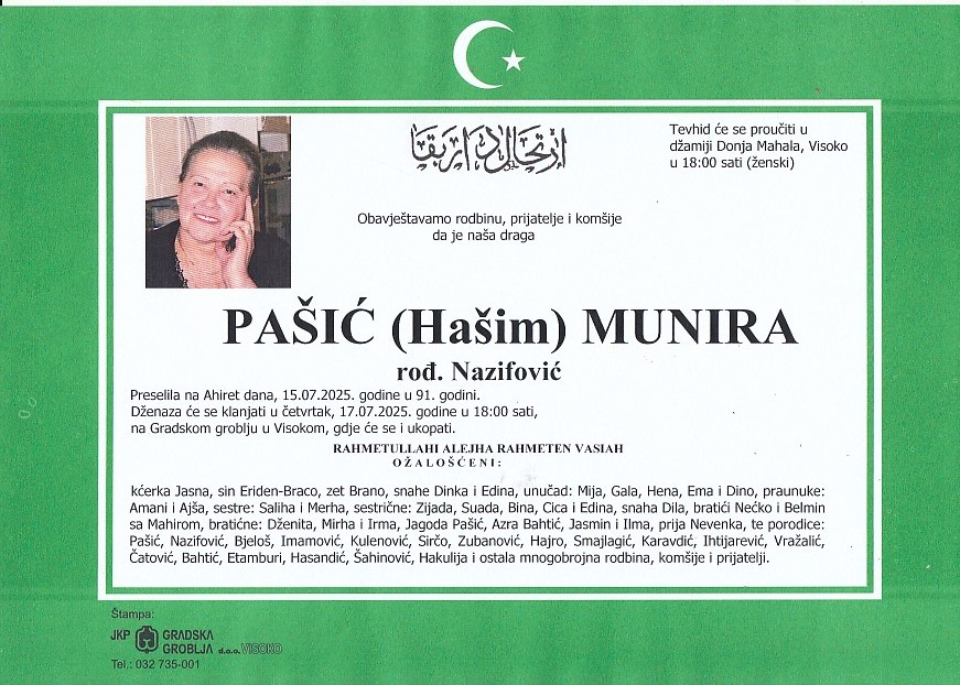 PAŠIĆ (Hašim) MUNIRA 17.07.2025. godine u 18:00 sati