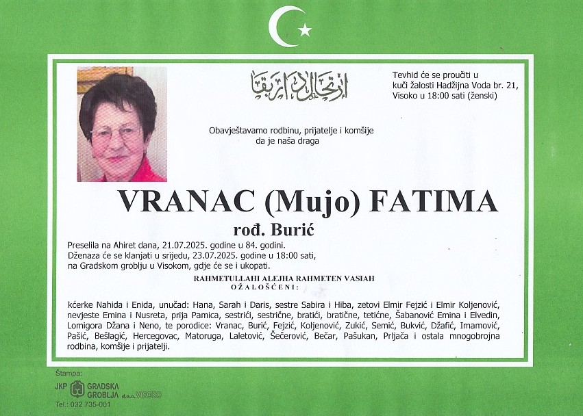 VRANAC (Mujo) FATIMA 23.07.2025. godine u 18:00 sati