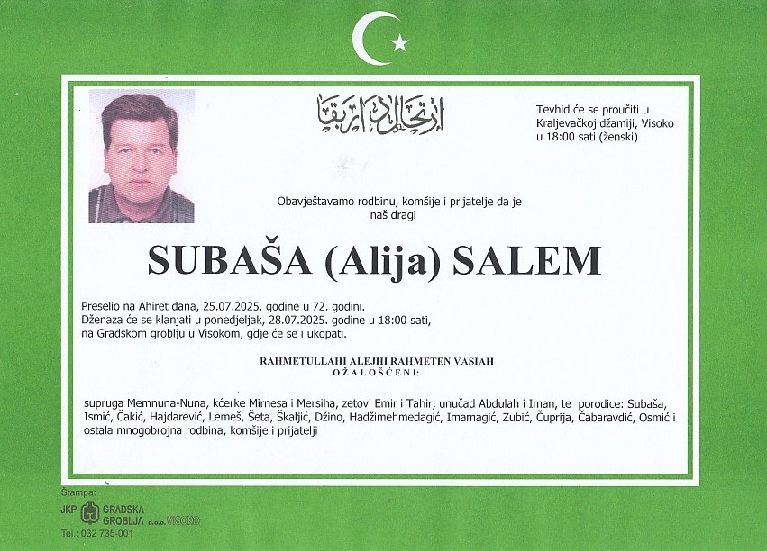 SUBAŠA (Alija) SALEM 28.07.2025. u 18:00 sati