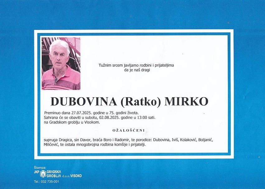DUBOVINA (Ratko) MIRKO 02.08.2025. u 13:00 sati