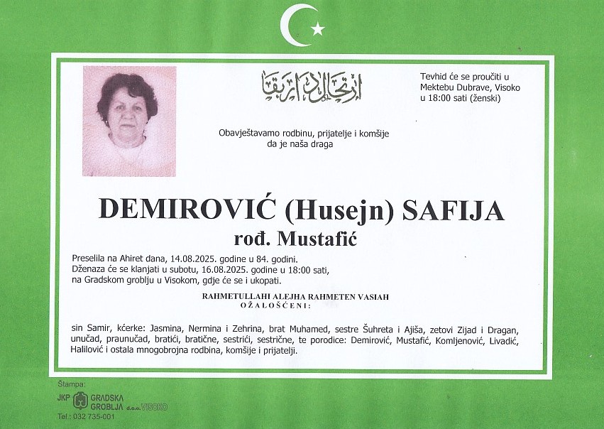 DEMIROVIĆ (Husejn) SAFIJA 16.08.2025. u 18:00 sati