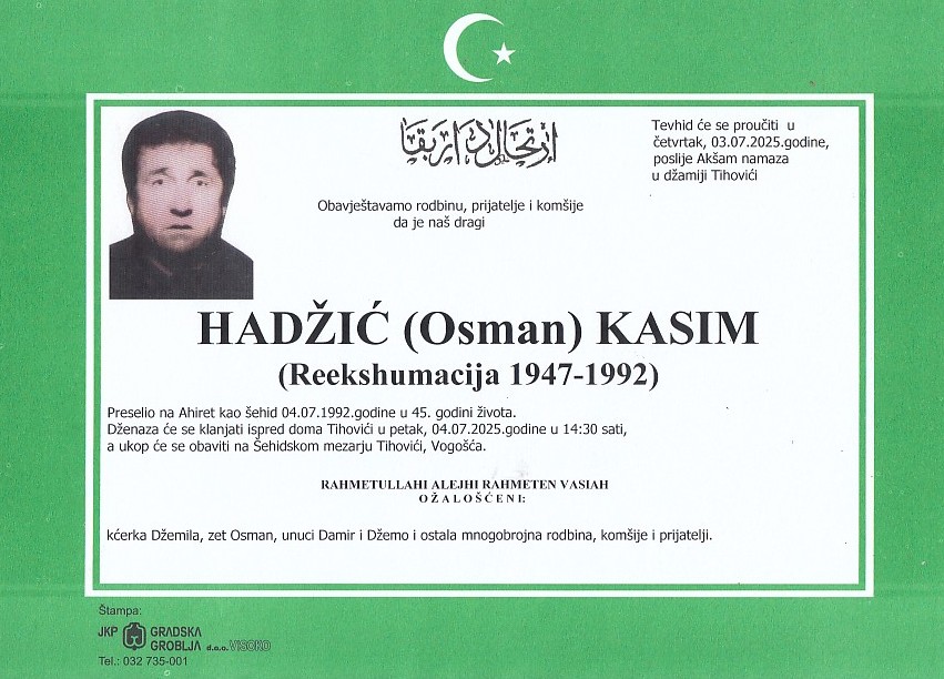 HADŽIĆ (Osman) KASIM 04.07.2025. godine u 14:30 sati