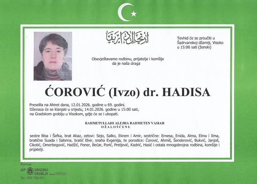 ĆOROVIĆ (Ivzo) HADISA 14.01.2026. u 15:00 sati