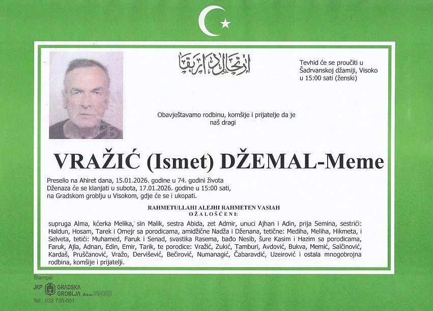 VRAŽIĆ (Ismet) DŽEMAL 17.01.2026. u 15:00 sati